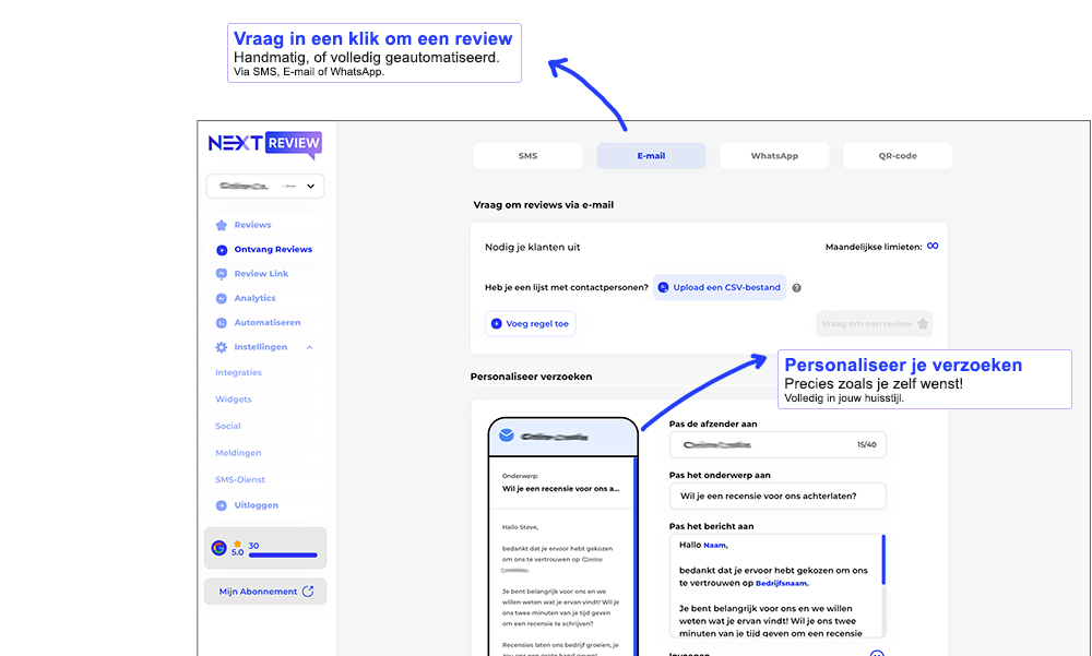 Beoordelingsverzoeken voor eerdere klanten via e-mail (tot 500) en sms (tot 100)